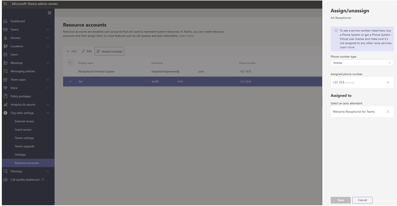 - Assign the Resource Account type to Auto Attendant