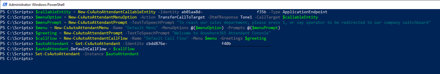 $greeting = New-CsAutoAttendantPrompt -TextToSpeechPrompt "Welcome to AnywhereNow Attendant Console" |