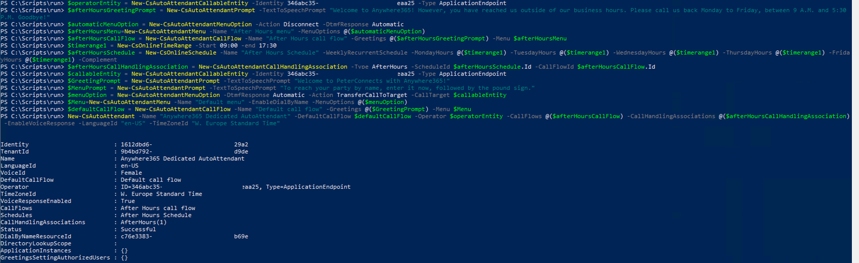 New-CsAutoAttendant-Name "A365 AA" -DefaultCallFlow$defaultCallFlow-Operator$operatorEntity-CallFlows@($afterHoursCallFlow) -CallHandlingAssociations@($afterHoursCallHandlingAssociation) -EnableVoiceResponse -LanguageId"en-US" -TimeZoneId "W. Europe Standard Time"