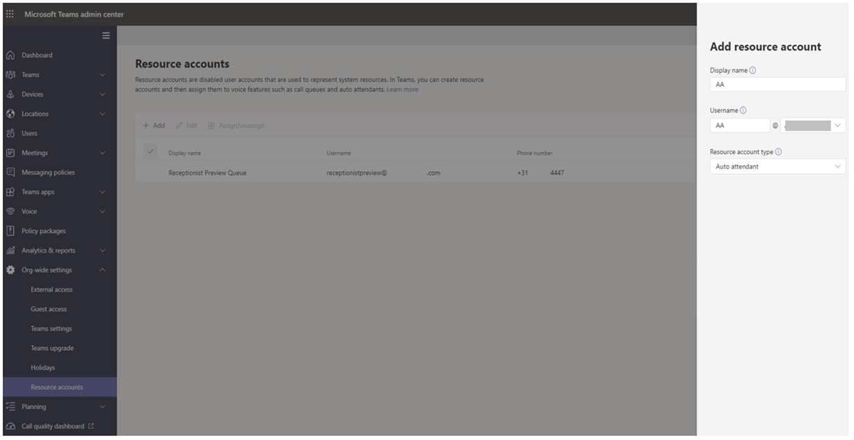 - Microsoft Teams Admin Center - Org-wide settings - Resource Account