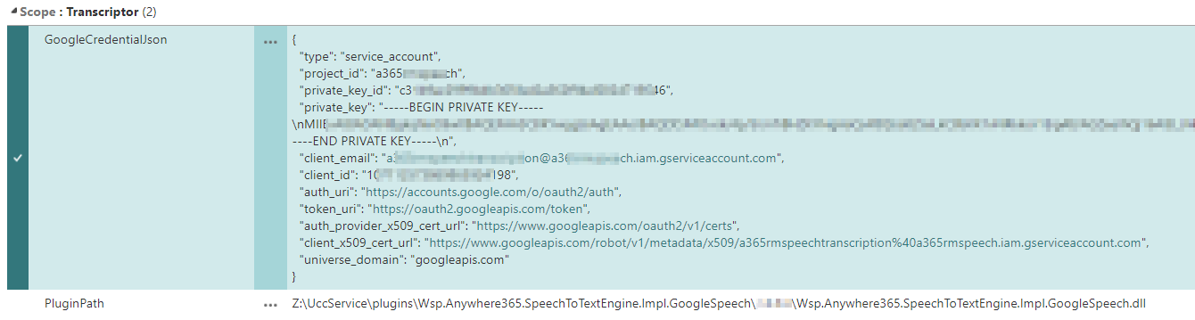 There are a few settings required to allow plugins to use transcription functions. The below first two (optional) settings can be set in the SharePoint UCC's general Settings list and allow transcribed text to be written to the general UCC log file for developer debug reasons. The other settings are vendor transcription plugin specific and go into the PluginSettings list. See expandable menu's below.