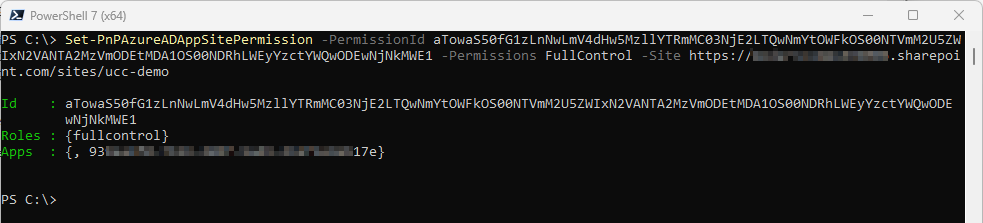 CopyPnP.PowerShellSet-PnPAzureADAppSitePermission -PermissionId <LongString> -Permissions FullControl -Site https://<tenant-name>.sharepoint.com/sites/<ucc-name>