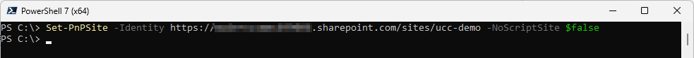 CopyPnP.PowerShellSet-PnPSite -Identity https://<tenant-name>.sharepoint.com/sites/<ucc-name> -NoScriptSite $false -