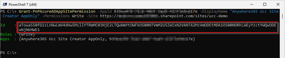 The output of this command will provide an ID string needed in the next step.CopyPnP.PowerShellGrant-PnPAzureADAppSitePermission -AppId <Guid> -DisplayName "<String>" -Permissions Write -Site https://<tenant-name>.sharepoint.com/sites/<ucc-name> -