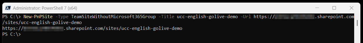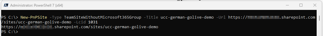 CopyPnP.PowerShellNew-PnPSite -Type TeamSiteWithoutMicrosoft365Group -Title <ucc-name> -Url https://<tenant-name>.sharepoint.com/sites/<ucc-name> -Lcid <4-Digits>Example for creating a site in the default (typically us-english) language: