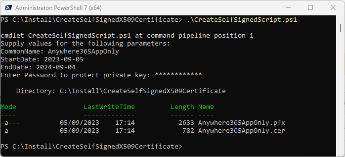 Copy and Run the Microsoft provided PowerShell script to generate your private X.509 certificate. When asked for: