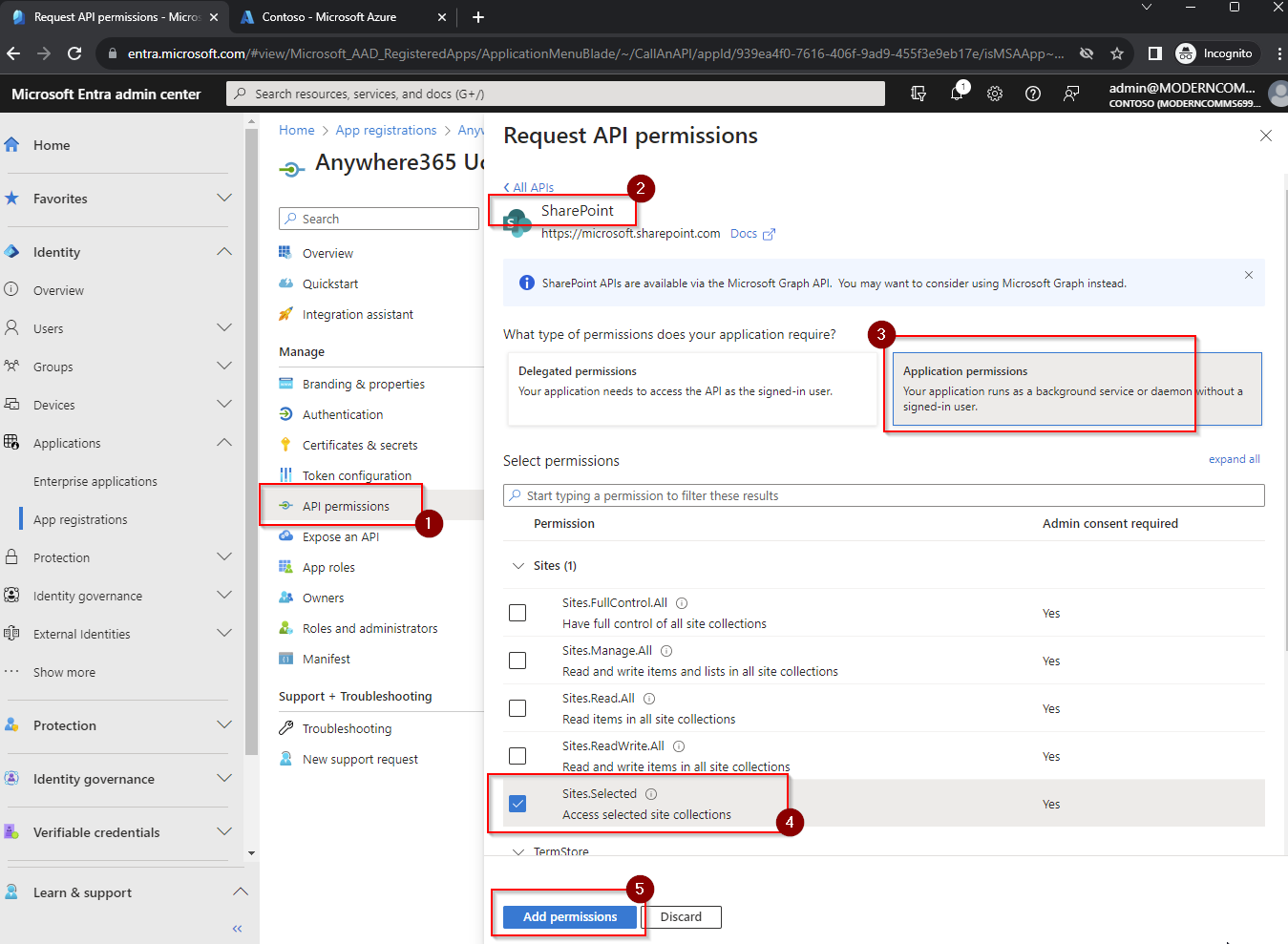 Step 5: Grant write permissions to the site for the App Registration created. (This is needed prior to elevate the permission to FullControl)