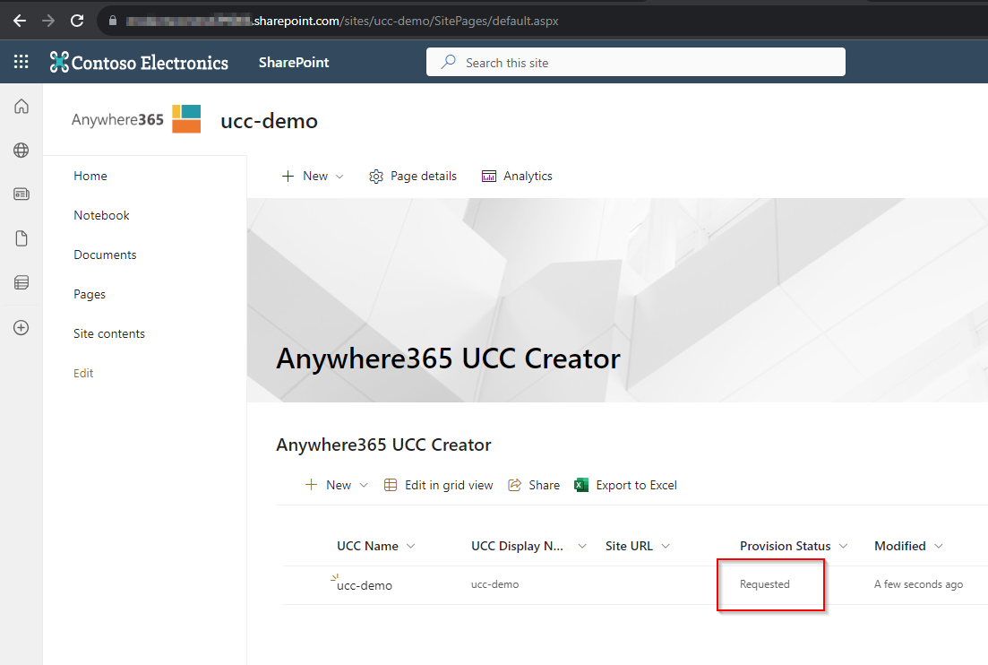 Navigate to the created site https://<tenant-name>.sharepoint.com/sites/<ucc-name>/SitePages/default.aspx