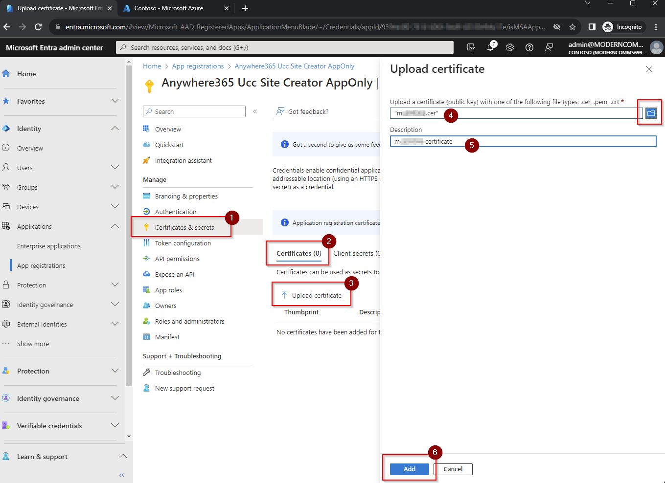Goto Certificates & secrets -> Certificates -> Upload certificates -> select your local .cer certificate file -> enter Description -> Add