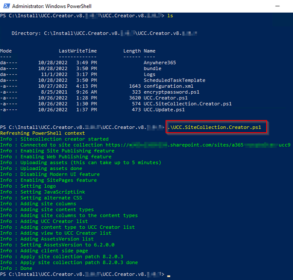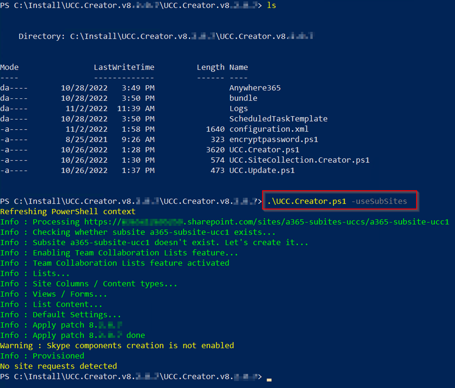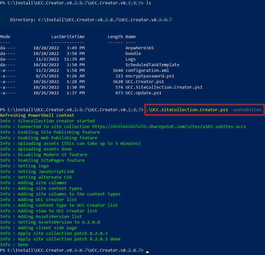 A NEW quicker install method for creating OneUCC Available since UCC.Creator v8.2.0.7. The model (preferred by Microsoft) in SharePoint on Microsoft 365 where no subsites are allowed. In this model each UCC will need its own separate SharePoint site (formerly known as site collection). This does allows for more granular user access and template updates per UCC. sites with AppOnly and certificate sites using PnP.Powershell and more restricted local permissions (selected sites only) can be found here: Creating a OneUCC Site using PnP.PowerShell