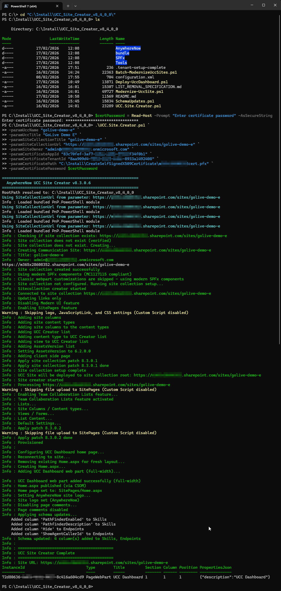 The UCC A Unified Contact Center, or UCC, is a queue of interactions (voice, email, IM, etc.) that are handled by Agents. Each UCC has its own settings, IVR menus and Agents. Agents can belong to one or several UCCs and can have multiple skills (competencies). A UCC can be visualized as a contact center “micro service”. Customers can utilize one UCC (e.g. a global helpdesk), a few UCC’s (e.g. for each department or regional office) or hundreds of UCC’s (e.g. for each bed at a hospital). They are interconnected and can all be managed from one central location..Site.Creator.ps1 script creates new UCC (Unified Contact Center) sites on SharePoint Online. Each site includes all required lists, content types, views, and the modern UCC Dashboard.