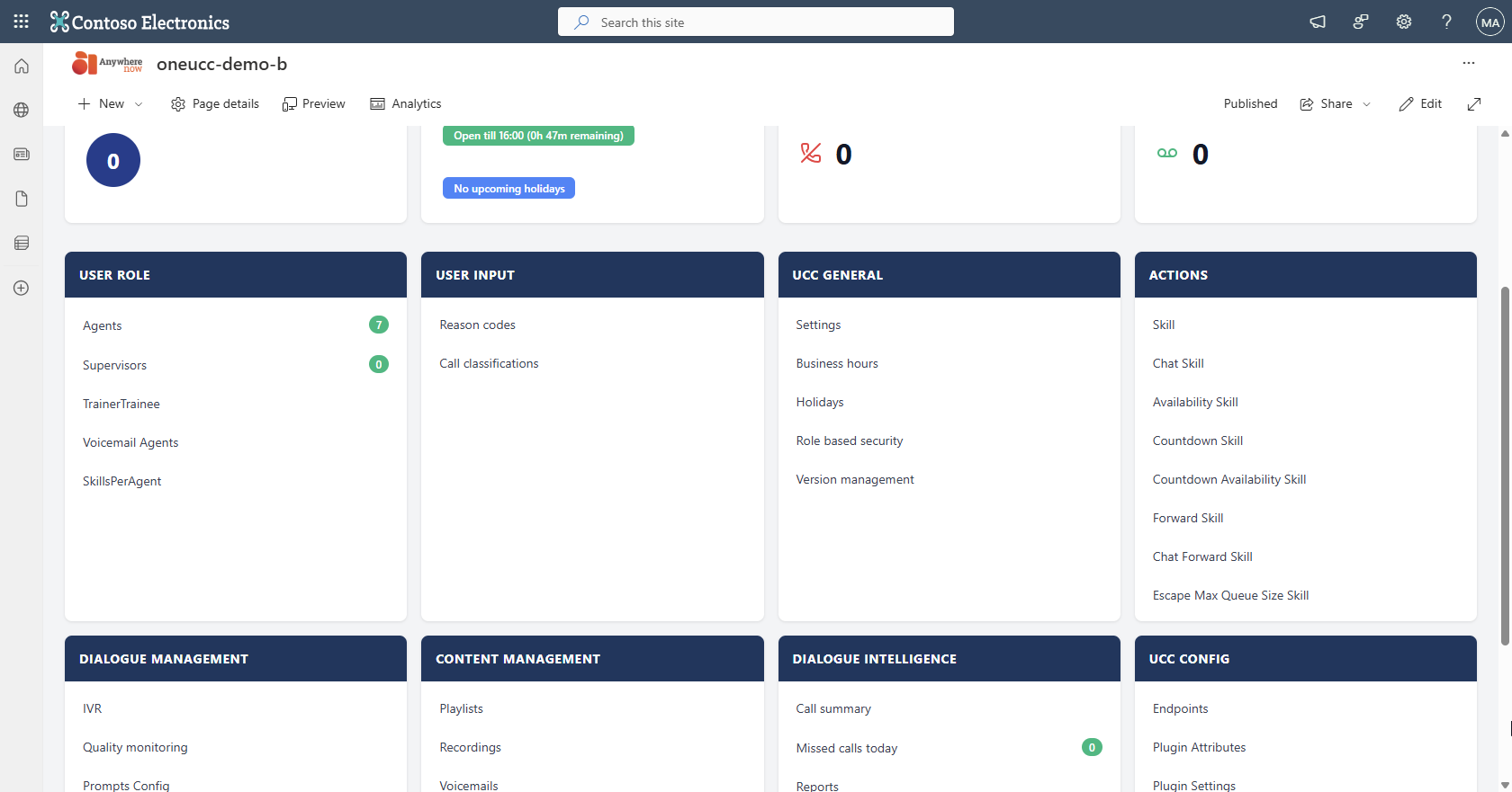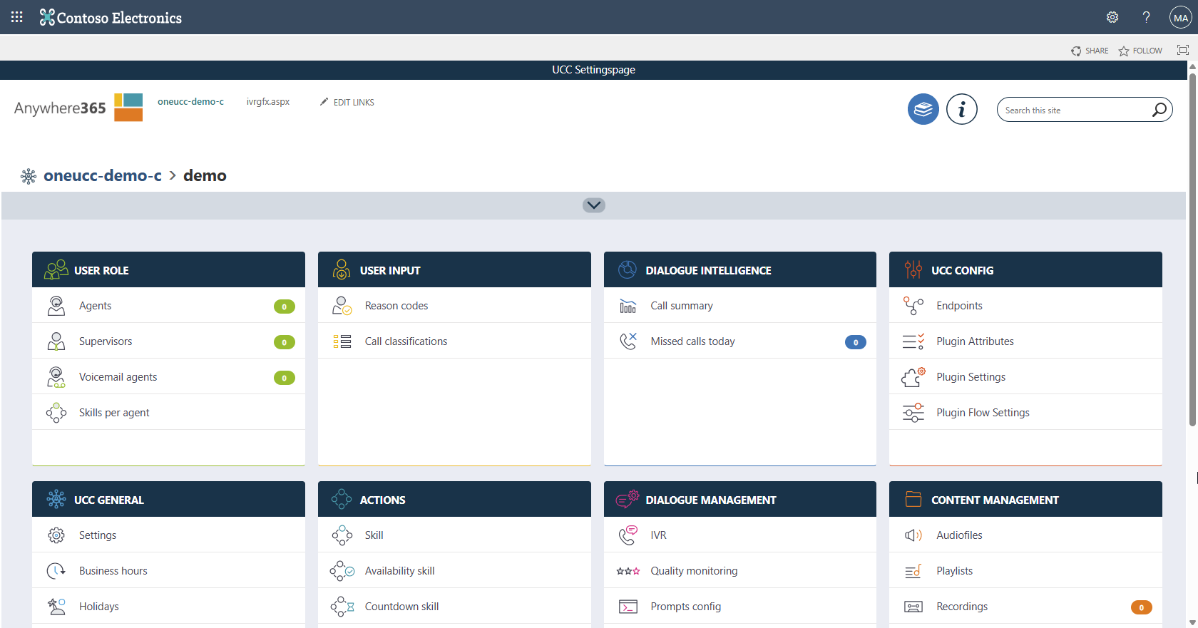The Deploy-UccDashboard.ps1 script deploys the UCC A Unified Contact Center, or UCC, is a queue of interactions (voice, email, IM, etc.) that are handled by Agents. Each UCC has its own settings, IVR menus and Agents. Agents can belong to one or several UCCs and can have multiple skills (competencies). A UCC can be visualized as a contact center “micro service”. Customers can utilize one UCC (e.g. a global helpdesk), a few UCC’s (e.g. for each department or regional office) or hundreds of UCC’s (e.g. for each bed at a hospital). They are interconnected and can all be managed from one central location. Dashboard SPFx package to your tenant's App Catalog. This is a one-time setup that makes the UCC Dashboard web part available to all SharePoint sites in your tenant.