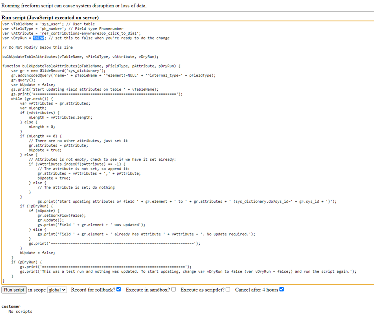 Change the value of var vDryRun to false (when value is set to true, it will only execute a test run) and click on the Run script button.