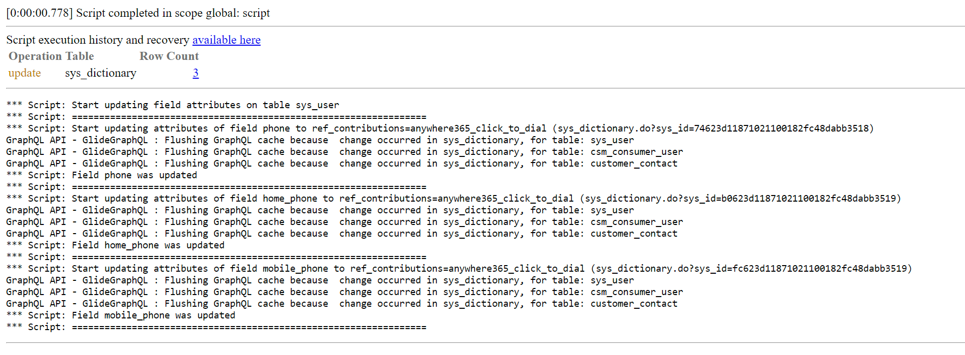 gs.print('Start updating attributes of field ' + gr.element + ' to ' + gr.attributes + ' (sys_dictionary.do?sys_id=' + gr.sys_id + ')');